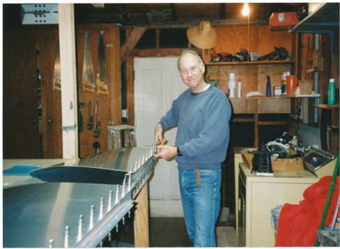 Building a Quick Build RV6A in 10 months Don McMullen & Bob Nauman On February 11/98 at 5:00 PM my front door rang and the UPS Man Delivered two packages to me. It was my Empenage Kit Friday 2/13/98 my tools arrived from Avery's Saturday 2/14/89 bought a forced air kerosene heater for the garage and worked on the gig for the horizontal stabilizer Monday 2/16/98 fabricated a level table on top of the gig & worked on the horizontal stabilizer. Tues., wed, Thurs., worked on horizontal stab. Made mistake and had to order two new parts so worked on vertical stab. Friday 2/20/98 worked on Rudder & stiffeners. Saturday 2/23/98 worked on rudder skeleton Monday 2/23/98 worked on elevator Tuesday 2/24/98 Primered skeletons, stiffeners drilled and dimpled right elevator Wed 2/25/98 worked on rudder Skeleton took rudder to Cecil Hatfield’s and he showed us how to back rivet and I back riveted the rudder stiffeners to the rudder skin. Thursday 2/26/98 worked on horizontal stab skeleton and left elevator. Dimpled skins & stiffeners. Friday 2/28/98 worked on horizontal stab skeleton, right elevator & stiffeners. Primed stiffeners and inside of skins Saturday & Sunday Worked on Horizontal stab skeleton worked on elevators primered stiffeners & other parts. Riveted stiffeners to skins. Tuesday 3/3/98 Worked on Horizontal stab. & Elevator. Wednesday 3/4/98 Worked on Elevators & trim tab Thursday 3/5/98 Worked on Elevators drilling out holes & clekoing skins on elevator skeletons. Friday 3/6/98 Worked on Elevators dimpled holes debured & primered parts. Saturday & Sunday Finished riveting the skins onto the skeleton of the elevators. Monday 3/9/98 Worked on Elevators riveting them together. Tuesday 3/10/98 Put vertical stab. Together. Wednesday 3/11/98 riveted vertical stab. Together. Thursday 3/12/98 took down table from gig and mounted horizontal stab in gig aliened the skeleton. Friday 3/13/98 Put skins on horizontal skeleton and drilled holes took apart and deburred and dimpled, primed skeleton and skins and got ready for riveting. Saturday 3/14/98 Finished riveting horizontal stab. Pop riveted bend in elevators and rudder. Complete except for trim tab and fiberglass tips. R V-" Quick Build Kit Going to Vans Aircraft at North Plains Oregon On March 24 to pick up Quick Build RV-6A 3/26/98 Arrived home with my quick build kit 3/26/98 to 4/7/98 Fabricated armrest Working on wings pitot tube. Conduit for wires, Ailerons, Bell crank, floor in fuselage 4/7/98 to 4/11/98 Modified fitted and installed wing tip ribs on left wing Worked on wings aileron & Flaps Flap brace Hinges and Mounts. Fitted and drilled, clecoed cockpit floor and baggage floor. 4/11/98 to 4/26/98 Modified, fitted and installed wing tip ribs on right wing Worked on flaps aileron flap brace and aileron gap seal fitted and drilled and dimpled top wing skin on both wings also primered all parts. Also completed bell cranks and push rods for both wings. Put together seat drilled and installed with clecoes. Installed landing light in right wing 4/26/98 to 5/5/98 Installed Left & Right armrest and Top right rail. Worked on floor Put in plate nuts for front and baggage floors. 5/5/98 to 5/12/98 Installed landing light in left wing. Removed badly installed center aileron mount and reworked it and reinstalled it. Worked on rudder pedals and breaks, and control rod for elevator. 5/12/98 to 5/25/98 Cut holes in Fuselage for vents, installed more plate nuts in baggage floor to make it removable, cut out Instrument panel and fit it in place, Installed conduit for electrical and antennas back to Empenage, Removed and dimpled rear & forward skins, Painted control stick & Rudder peddles Installed rudder cables. 5/25/98 to 6/14/98 Mounted empenage horizontal stabilizer elevators and control linkage & control stick, adjusted elevators for max. Deflection. Installed Vertical stabilizer & rudder cut out and adjusted for maximum 25 degrees of deflection. Installed rudder & elevator stops. Installed rear top skin. Installed motor recess in firewall. Installed shoulder harness mounts installed horizontal stabilizer fiberglass tips and elevator fiberglass tips 6/1/98 to 7/1/98 Riveted on rear skin, Received instruments from vans, figuring out how to set up instrument panel, put plate nuts on main wing tips. Made brackets for break lines. Fit, trimmed, and clecoed forward rear skin on. Fit, trimmed and clecoed forward skin on 7/1/98 to 7/9/98 Put plate nuts on main wing tips. Cut & trim rear fuselage for rudder to fit. Removed rudder stops to re-position for 35 Degree swing. Trimmed skin off the rear of vertical stabilizer and lower rear of fuselage. Made brace for break hoses up front. Installed plate nuts on Instrument panel so as to make it removable. 7/9/98 to 7/23/98 Waiting for finish kit to arrive from vans. Doing a little pre planning such as drilling holes in a plywood template Instrument panel for the gages. Trying to figure out where the gas lines, break lines, fuel switch will go? 7/24/98 Finish Kit arrived Bob come over to help me unpack and inventory everything. Going on vacation for a week up to the sierras Courtright & Wishon reservoir Finish Kit. Getting Side tracked from being able to work on kit. Having to fix up house on Myrna dr. To sell it. 8/1/98 Finally getting started on the finish kit Started working on the sliding canopy frame sliding rails side and rear. Riveted on rear forward top skin. Put in some more break lines. Mounted windscreen roll bar and forward support brackets 10/24/98 Had lots of trouble with sliding canopy, couldn't get canopy frame to fit right we bent and bent and then bent it again. Until I got it as close as I could. There were some gaps of almost 1/2 inch where the slider met the roll bar so I cut some of the left over plastic from the canopy and made shims out of it. I hope this works. I put on the side skirts and the rear skirts and didn't like them so I reorder some more aluminum sheet and made them over. Bob is p