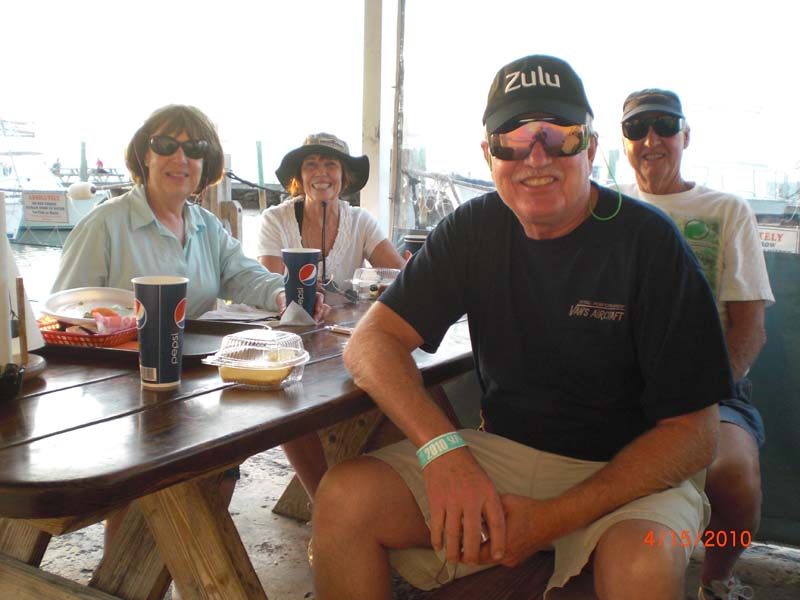 After lunch we drove back to Zephyrhills, turned in our rental car and departed for Marathon Key, only a 1 1/2 hour flight. We had good weather except for the 25 kts cross wind. The people at the GA aviation FBO were great, got us a rental car and gave us all kinds of breaks. We took all of our stuff to the Ranch House Motel and went to a recommended fish market/restaurant with tables on the dock to watch the sun set while the pelicans dove for dinner. We had the best sea food in the world. After dark they turned on the lights in the marina and we could see 4 ft tarpon fish swimming in the harbor.